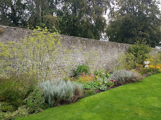 Flowers still bloomed in late September in the Walled Garden behind the mansion. The gardens of larger houses, as at Oldbridge, were usually enclosed by high walls for protection from the elements and theft. One hectare of garden could produce food for about 25 people and about 5 gardeners were needed per hectare. The gardens supplied the family, servants and sometimes the estate staff with fruits and vegetables all year. The gardens all supplied the house with flowers.
